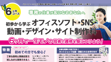 事務職に必要とされるパソコンやオフィスソフト、事務知識スキルを中心に学習し、これからの事務職により活用できるWeb更新スキルを学びます。